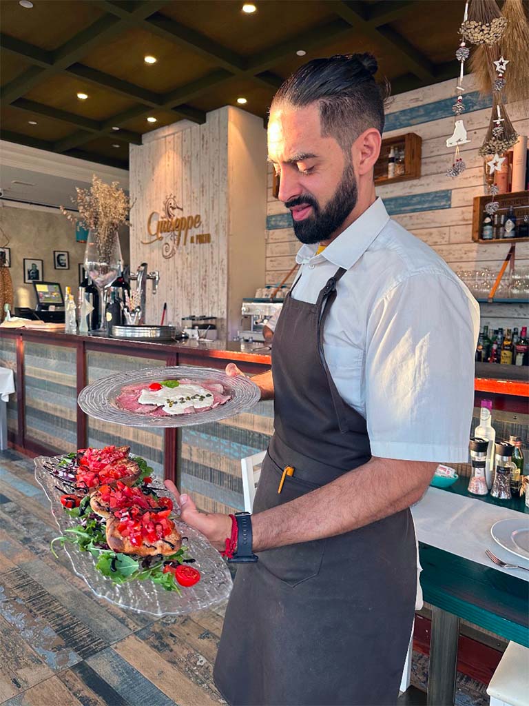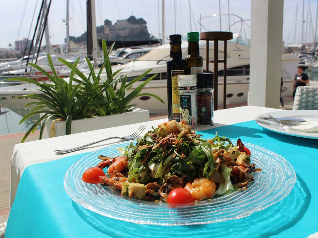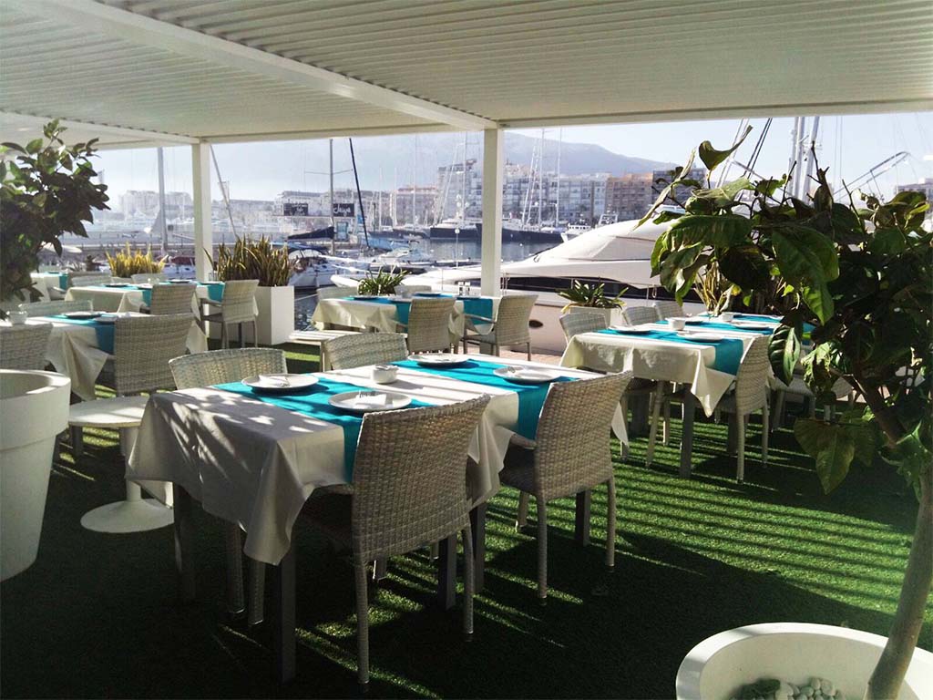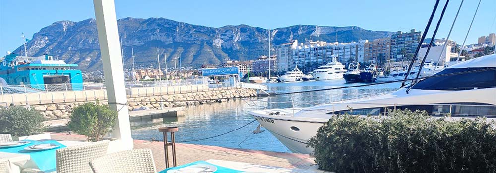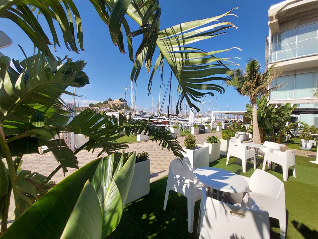 Stylish terraced restauant by the water and ferry terminal in Porto Balearia, Denia.